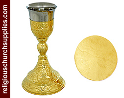 This chalice and paten (or plate) used to hold consecrated wine and the Eucharistic wafer during the Mass.